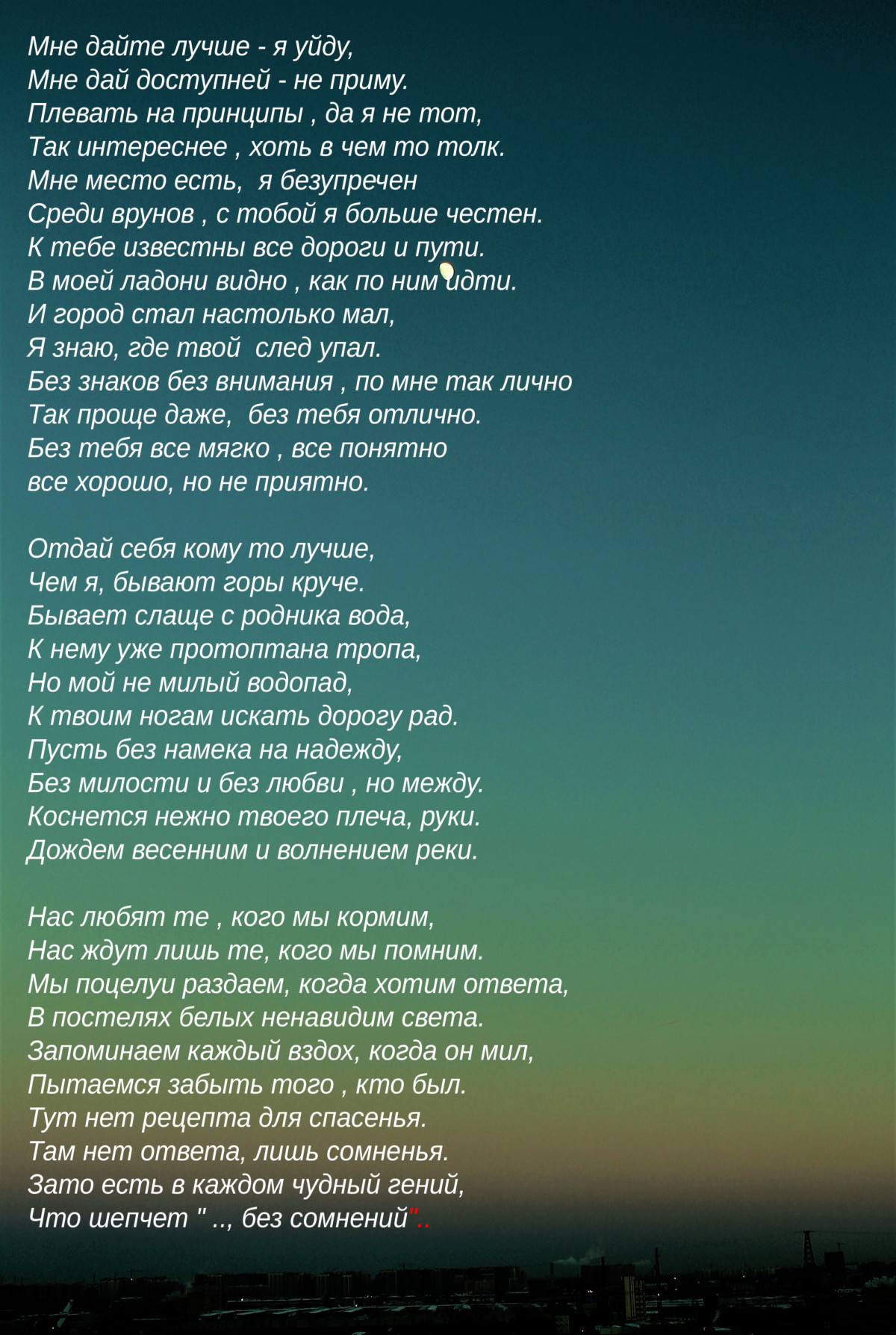 Они отняли у неё даже имя. Подумать только, имя! Ничего, того что, она считала “своей” жизнью ей никогда не принадлежало. Дождь, набирал обороты. Громкие, тёмные дождевые капли и тьма, которая становилась настолько непроглядной, что поглощала все ...