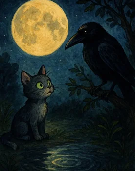 Я наступил в лужу, на отражение луны, но тут же одернул лапу, потому что Луна задрожала и могла упасть на меня. Я снова заглянул в лужу и увидел там свою усатую мордочку с широко раскрытыми ярко-зелёными глазами.Если бы я умел думать, то обязательно ...